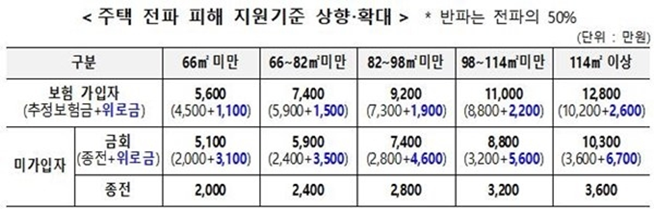 기존에는 주택 규모에 따라2천만 원~3천600만 원이 주어졌는데, 위로금3천100만 원∼6천700만 원을 지급해 보험 가입자의 80∼90% 수준으로 지원하기로 했다. 형평성을 위해 보험 가입자에게는 별도의 위로금을1천100만 원~2천600만 원까지 지급한다.